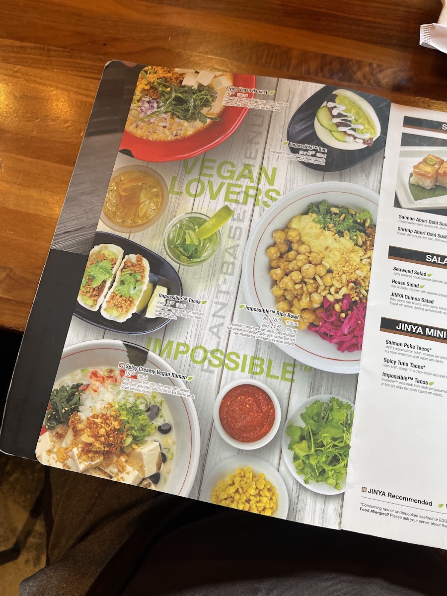 Highlights include rich, flavorful options like the Spicy Miso Ramen and Tonkotsu Black Ramen, as well as lighter choices such as the vegan-friendly Spicy Creamy Vegan Ramen and fresh salads. Small plates like the JINYA Bun and Impossibletm Gyoza complement the main dishes perfectly, offering satisfying bites to start or share.